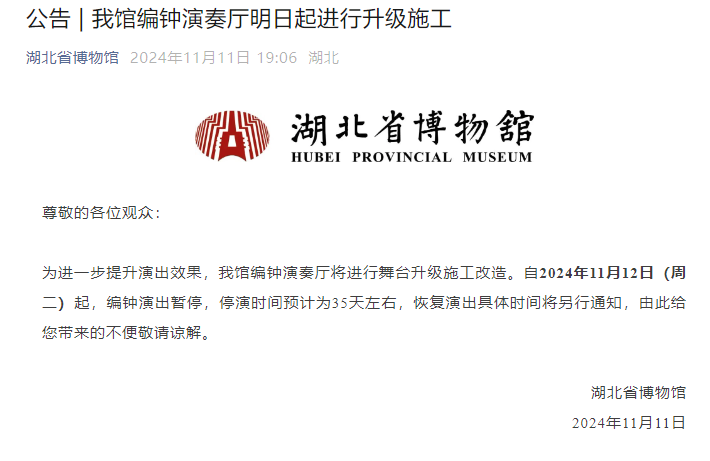 此前,湖北省博物馆曾发布公告,自11月12日起,暂停编钟演出。