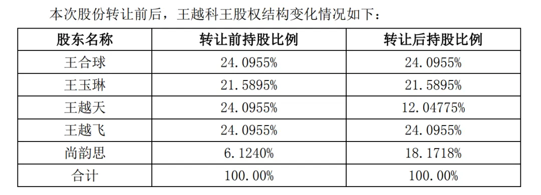 据公告显示,王越科王持有欧陆通约28.89%股权。其中王越天持有王越科王24.1%股权,转让后持股比例变更为12.05%。尚韵思持有王越科王6.1%股权,转让后持股比例变更为18.2%。