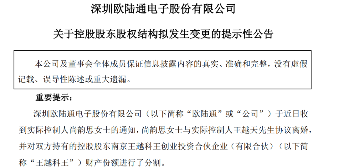 12月23日晚间,欧陆通公告称,公司于近日收到实际控制人尚韵思的通知,尚韵思与实际控制人王越天协议离婚,并对双方持有的控股股东南京王越科王创业投资合伙企业(有限合伙)(简称“王越科王”)财产份额进行了分割。王越天拟将其持有的王越科王12.05%的股份转让给尚韵思。上述股权变动尚需办理工商变更登记手续。此次控股股东股权结构调整完成后,公司控股股东及实际控制人均未变更。