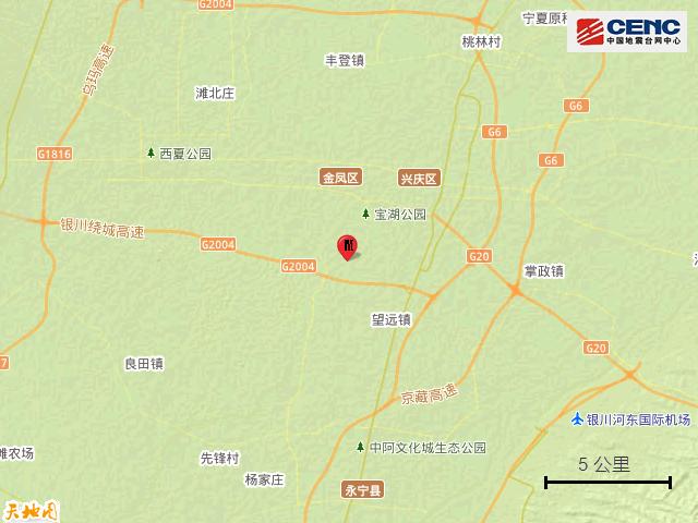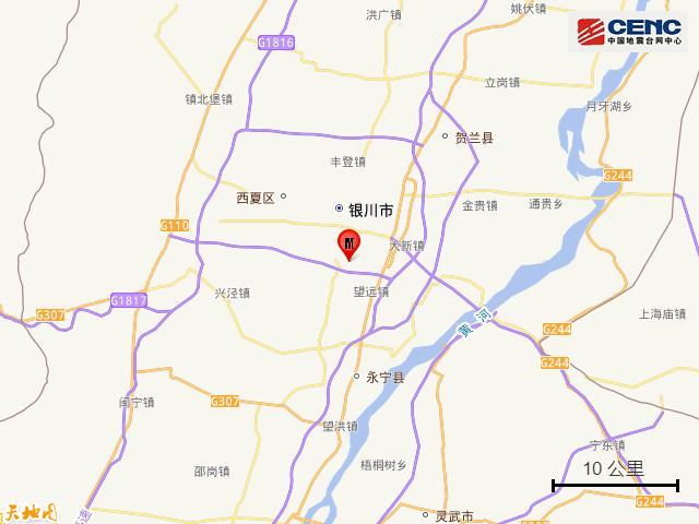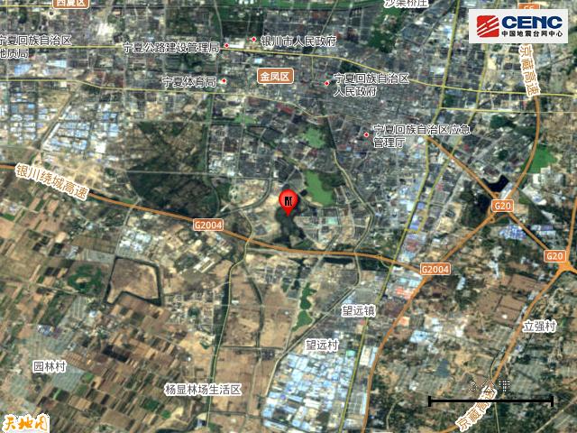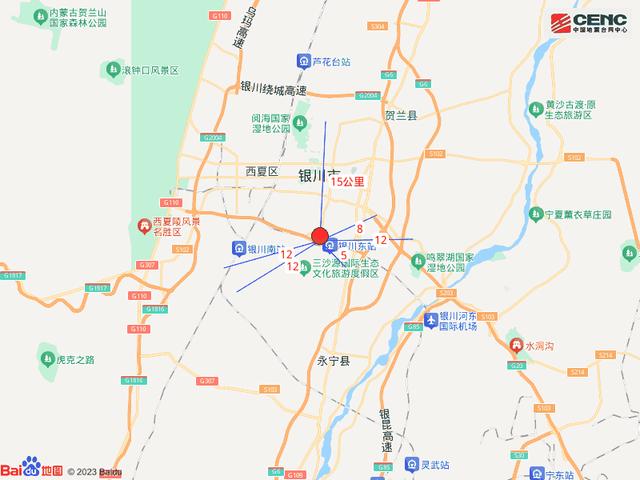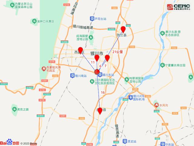 震中距金凤区6公里、距兴庆区7公里、距西夏区11公里、距永宁县16公里、距贺兰县21公里,距银川市6公里。
