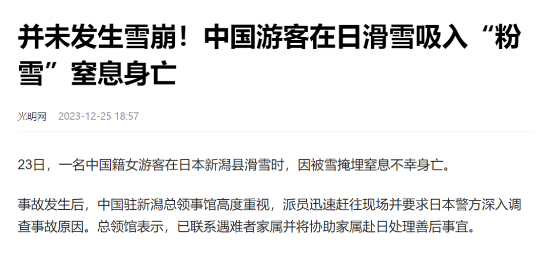 根据上海科技馆微信公众号今年2月发布的一篇科普文章称,因为“粉雪”的松软,人们摔倒时虽然像有气垫托着般不太疼,却容易让人陷得很深,难以单独爬起来,且容易在滑手倒地时灌入口鼻,被动吸入,导致窒息。