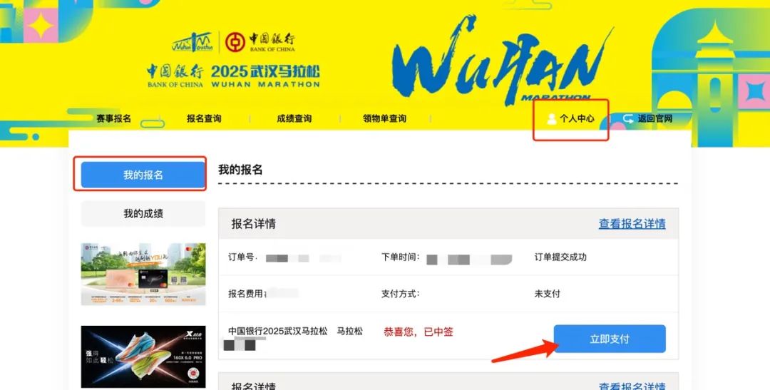 通过官网及马拉马拉APP报名,且在二次抽签中签的选手,请使用电脑或手机浏览器(非微信环境下),打开赛事个人中心页面:https://wuhan-registration.mararun.com/personal.html(长按复制网址),二次中签选手应在12月28日24点前按照页面提示完成报名费缴纳。