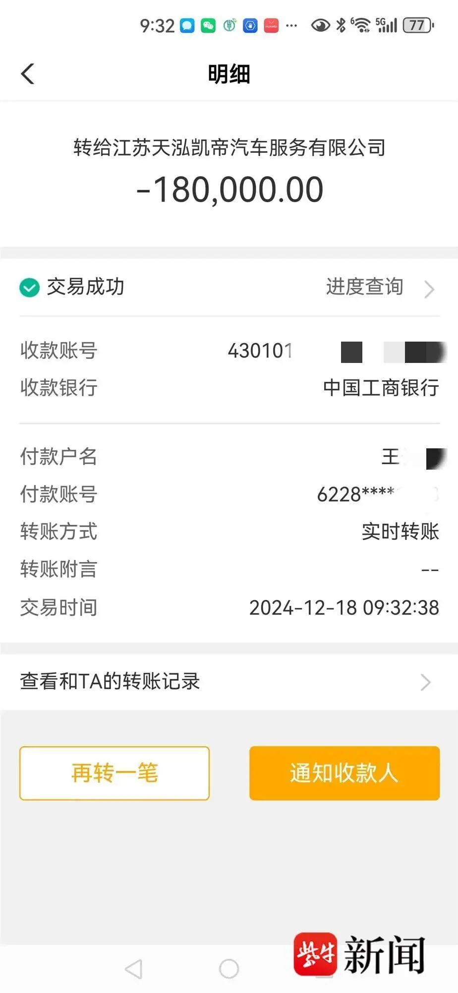 “在缴纳购车款时,陈某某要求我直接把钱转给她,由她交给公司。于是,我通过微信、支付宝和银行转账三种方式,共向陈某某的个人银行账户转了26万元。”张先生表示,因为转账是在店内进行的,且陈某某是店内员工,自己又是第一次买车,不懂流程,所以相信了对方。由于新车需要装潢,张先生当天没有提车,约定过几天再来。