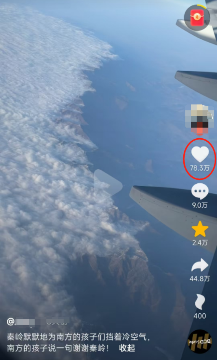 近日,网友朱先生(化名)在飞机上拍到秦岭左侧是滚滚云海、右侧是云淡风轻的场景,于是感叹:“秦岭默默地为南方的孩子们挡着冷空气,南方的孩子说一句,谢谢秦岭!”截至目前,该视频引发78.3万人点赞、9万人评论、44.8万人转发。