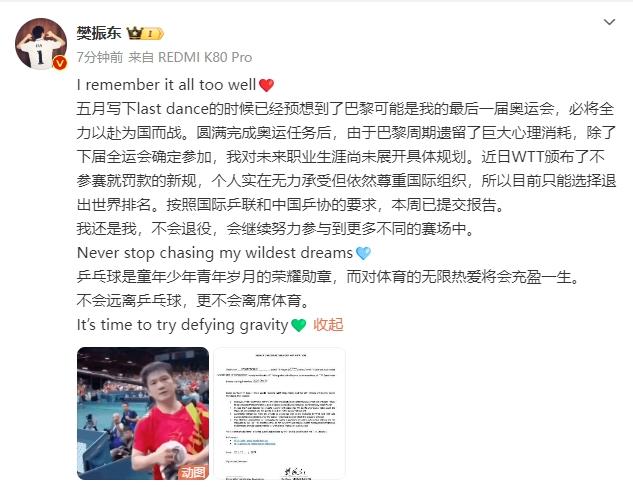 五月写下last dance的时候已经预想到了巴黎可能是我的最后一届奥运会,必将全力以赴为国而战。圆满完成奥运任务后,由于巴黎周期遗留了巨大心理消耗,除了下届全运会确定参加,我对未来职业生涯尚未展开具体规划。近日WTT颁布了不参赛就罚款的新规,个人实在无力承受但依然尊重国际组织,所以目前只能选择退出世界排名。按照国际乒联和中国乒协的要求,本周已提交报告。