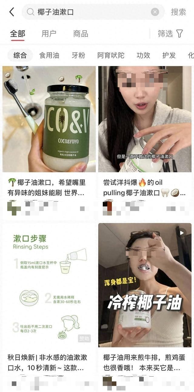 在某网络平台平台搜索栏敲入“椰子油漱口”几个字,显示有超过一万条笔记分享。女星张静初也曾推荐过这样的方法,宣称可以“美白牙齿、清洁口腔、排出身体毒素”。