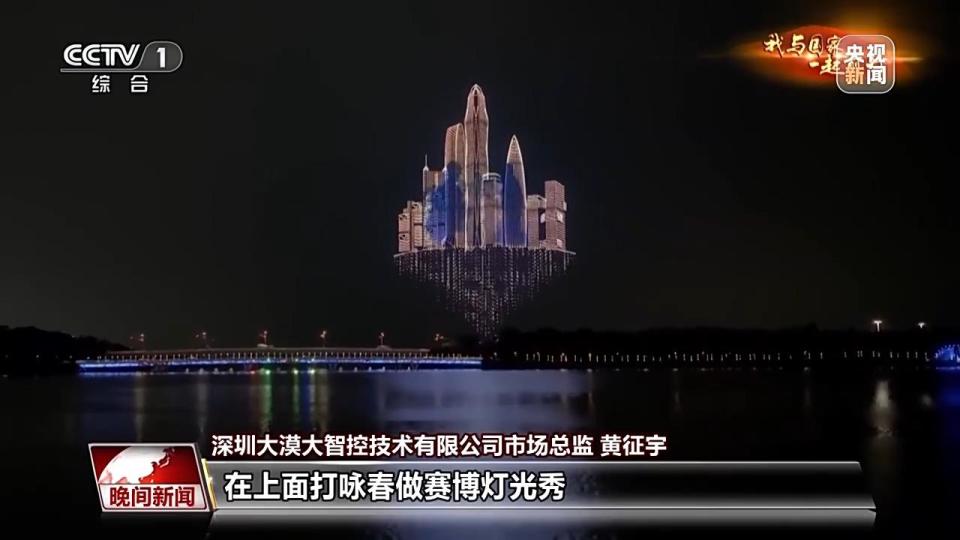 深圳大漠大智控技术有限公司市场总监 黄征宇:我们居然在空中做了一座“海市蜃楼”,把深圳的地标融合到一块,在上面打咏春做赛博灯光秀。