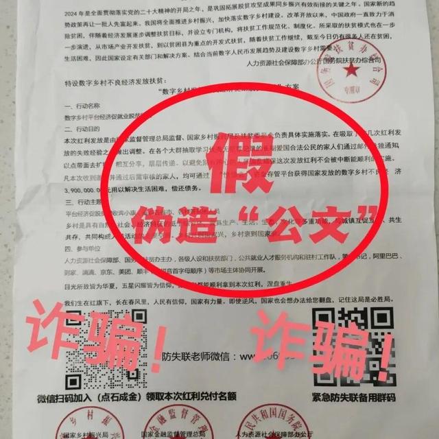 此类骗局往往紧跟时事热点、重点政策,利用群众对政策理解的偏差,通过伪造国家机关印章制作假文件博取信任,利用受害人迫切寻求帮扶的心理,引导受害人点击涉诈链接、下载涉诈App,以缴纳“激活金”“手续费”“个人所得税”“解冻金”等理由,让受害人不断转账,直至掏空钱包。