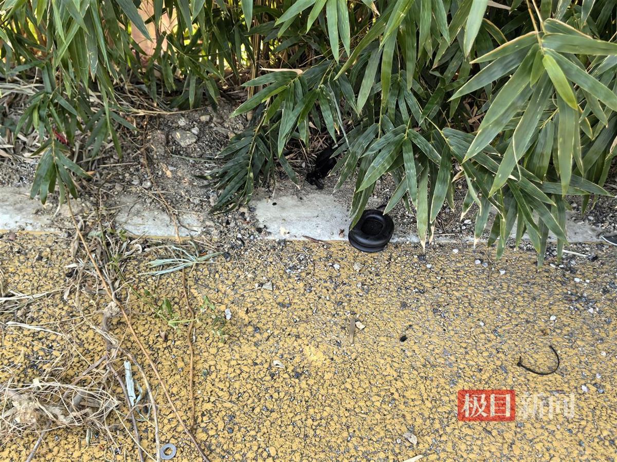 在文化广场内靠近一旁灌木丛的区域,能够看到地面上有深色油渍的痕迹,柏油地面破损,出现几个小坑。地面散落着耳机、耳罩、扣带、细小零件等残留物。