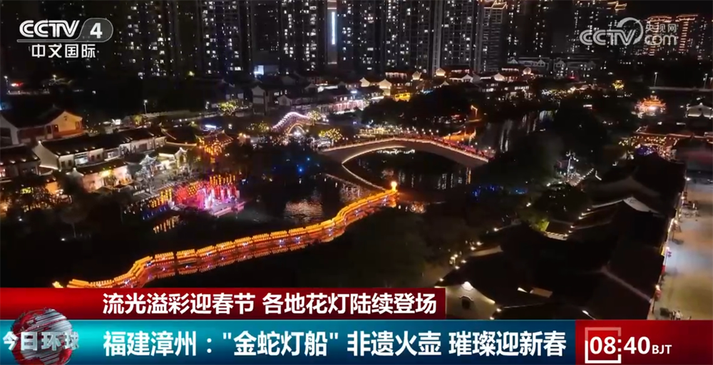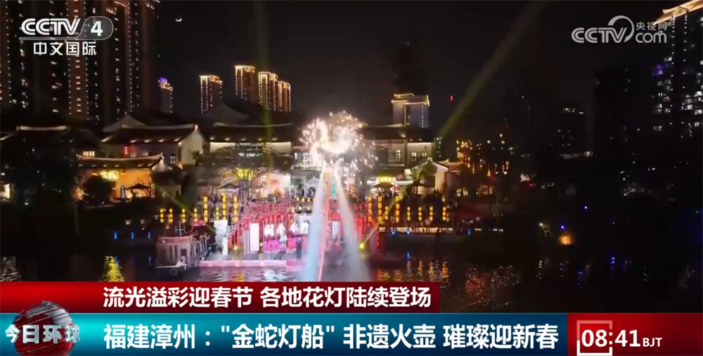 在福建漳州,一条由2025个福灯连接而成的百米“金蛇灯船”,在河道中蜿蜒游弋,宛若一条被赋予灵气的金蛇穿过夜幕,船过之处,市民和游客纷纷驻足观赏祈福。与此同时,水上飞人身着华丽服饰,手持非遗火壶,在水面上翻飞腾跃,火花在空中飞溅,仿佛璀璨烟火在夜空中绽放。