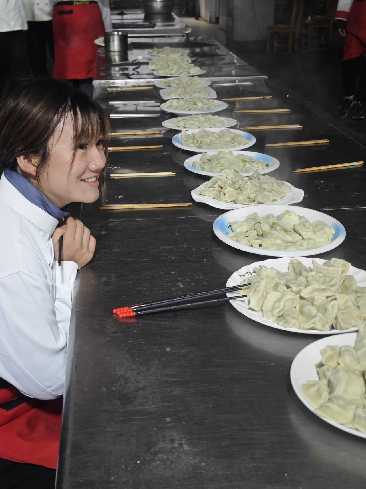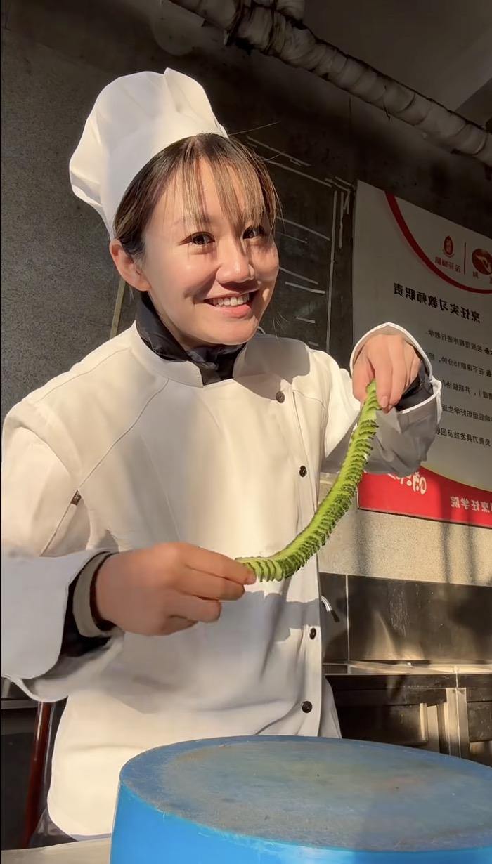 佟洁琼:我是上个月13日来的蓝翔。刚开始,从基本功练起,学了一段时间刀工和掌勺。锅里装着玉米或沙子,来回地练习,非常需要手臂和手腕的力量,常常学了一天之后,手臂都抬不起来。