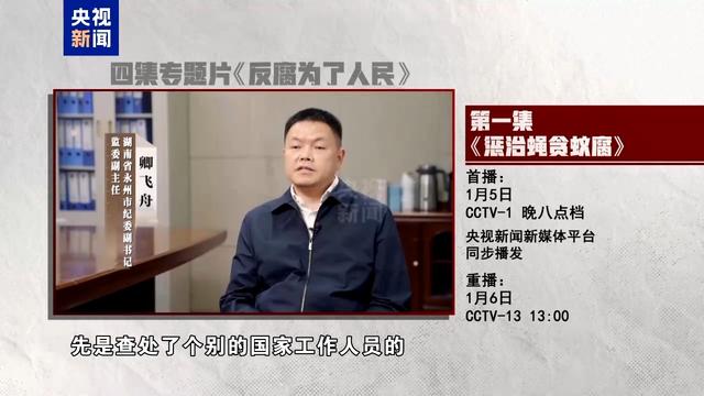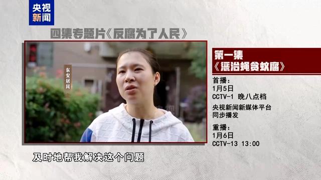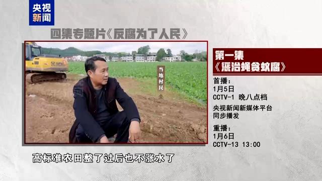 电视专题片《反腐为了人民》第一集《惩治蝇贪蚁腐》,讲述纪检监察机关聚焦群众反映强烈问题,推动开展校园餐、高标准农田建设、住房保障和安居工程等整治工作,让群众从一个个具体问题的解决中感受到整治成果,不断增强获得感、幸福感、安全感。央视综合频道1月5日晚8点档播出,央视新闻新媒体平台同步播发,敬请关注。