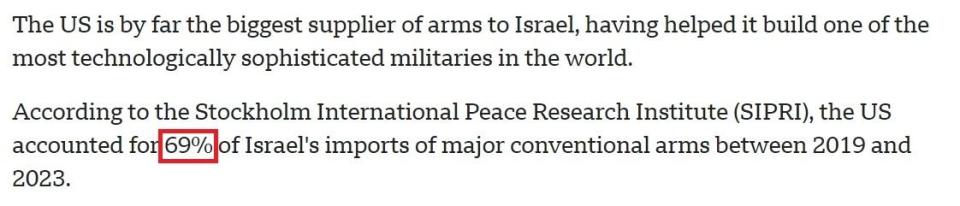 根据斯德哥尔摩国际和平研究所的数据,2019年至2023年间,以色列进口的主要常规武器有69%来自美国。
