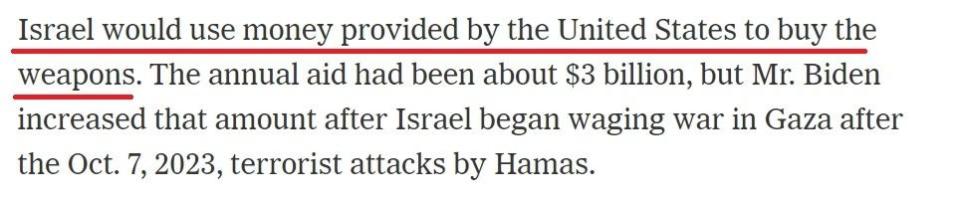 《纽约时报》在报道中特别提到,以色列将使用美国提供的资金购买美国制造的武器。