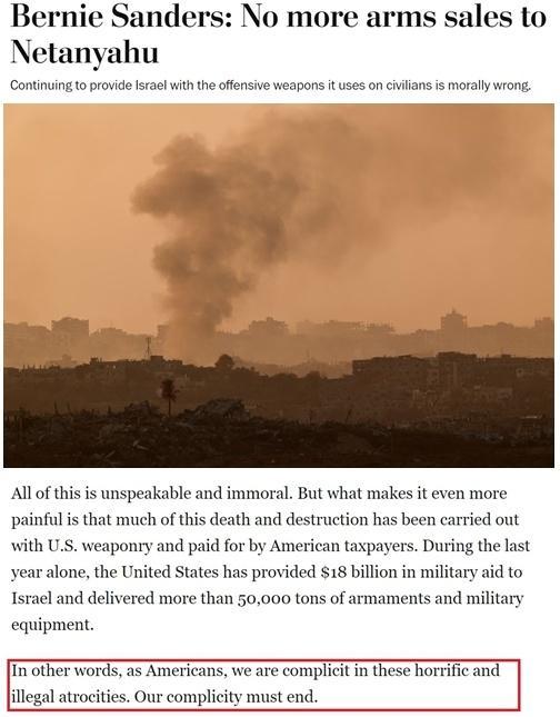 桑德斯此前曾发表题为《别再向内塔尼亚胡出售武器》的文章指出,过去一年多以来,加沙局势日益糟糕,现在的恶化程度更是难以想象。更令人痛心的是,这些死亡和破坏大部分是用美国武器实施、并由美国纳税人买单的。
