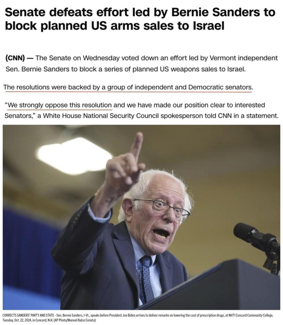 一个多月前,伯尼·桑德斯等十几名美国进步派参议员出于对加沙人道主义灾难的担忧,曾在参议院提交一份法案,试图阻止拜登政府向以色列销售武器,但该法案最终被否决。