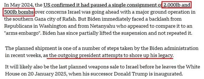 英国广播公司的报道认为,作为卸任前采取的一系列措施之一,拜登试图通过最新对以军售计划巩固自己的“政治遗产”。