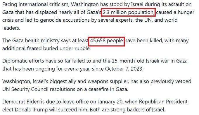英国《新阿拉伯报》:以色列对加沙的军事行动已造成至少近4.6万巴勒斯坦人丧生,可能还有很多人被埋在瓦砾下未被发现。这场暴力还使加沙230万人口几乎全部流离失所,并造成严重人道主义危机。到目前为止,外交努力未能结束加沙长达15个月的战争。而面对国际社会的批评,美国一直站在以色列一边。
