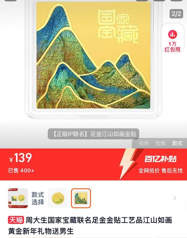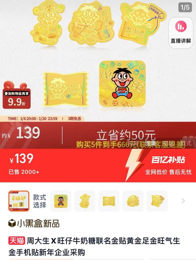 除了传统的“财神爷”“招财猫”等款式外,线上售卖的黄金贴纸还联名了许多知名IP,主打在新年送礼清单中大放异彩。