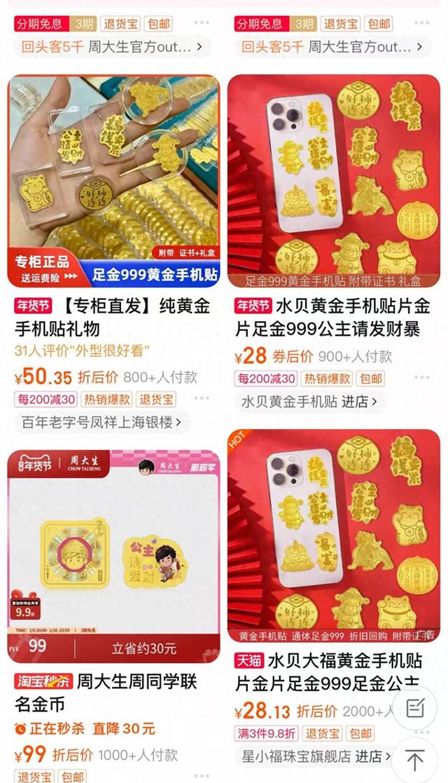 通过检索电商平台发现,黄金贴纸的款式多样且销售火爆,其中还不乏周大生、老凤祥等知名品牌店铺在售卖,价格上从二三十元到一百多元不等。