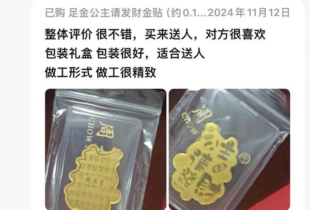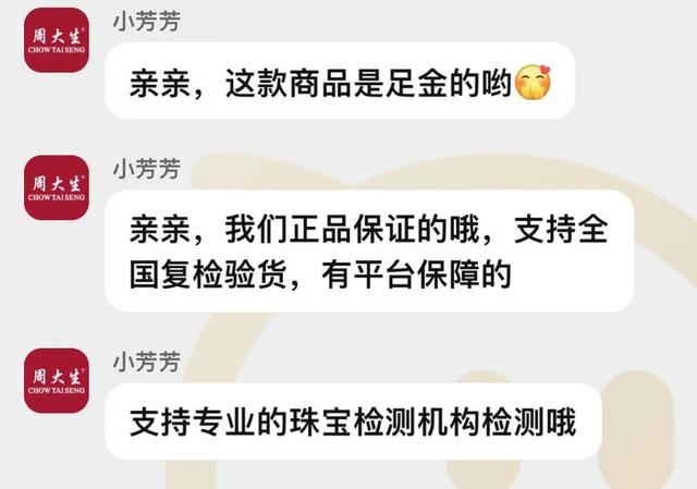 而据客服介绍,商品为足金打造,店铺销售的黄金贴纸也支持珠宝检测机构检测。