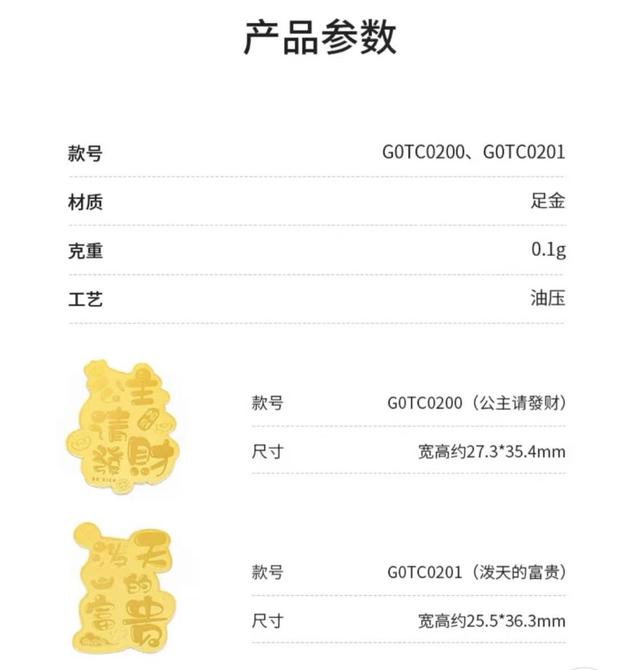 在周大生官方店铺,其售卖的黄金贴纸价格大多在130—150元之间。点击其中一款商品的详情页面,能看到背面印有“公主请发财”“招财”的字样。在产品参数方面,贴纸重量0.1g。尺寸方面,宽度25mm至27mm,高度在35mm至37mm。