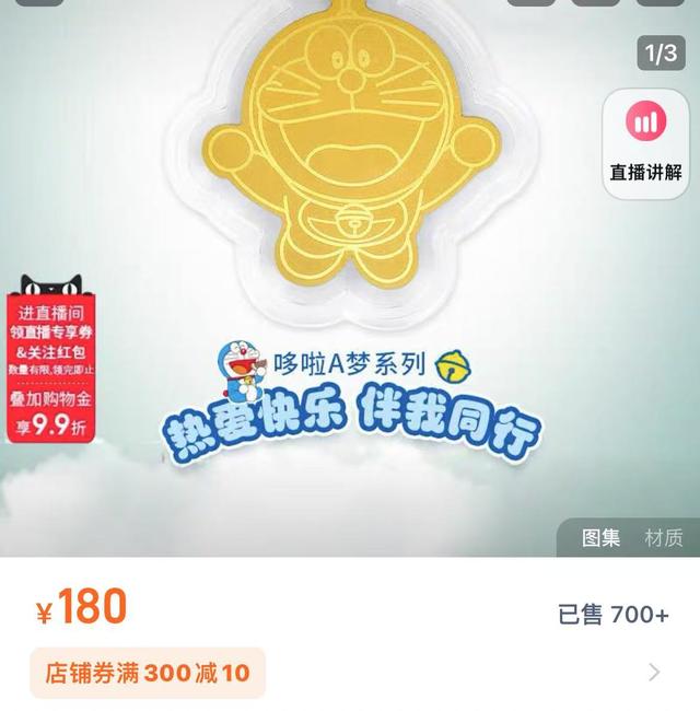 有店铺自称“哆啦A梦独家正版授权”,克重0.1g的黄金贴纸售价180元,已售出700多单。