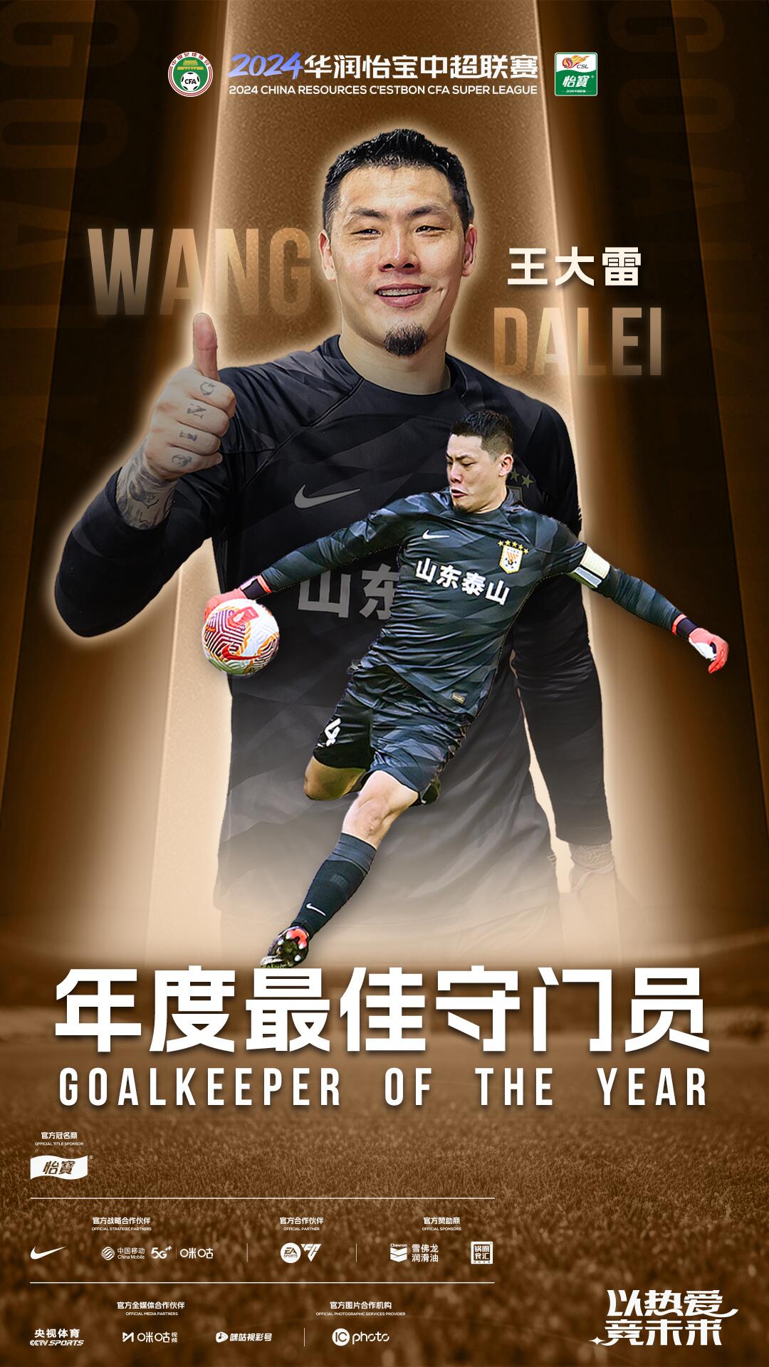 山东泰山门将王大雷荣获2024赛季中超最佳守门员,球员也成功蝉联该奖项。