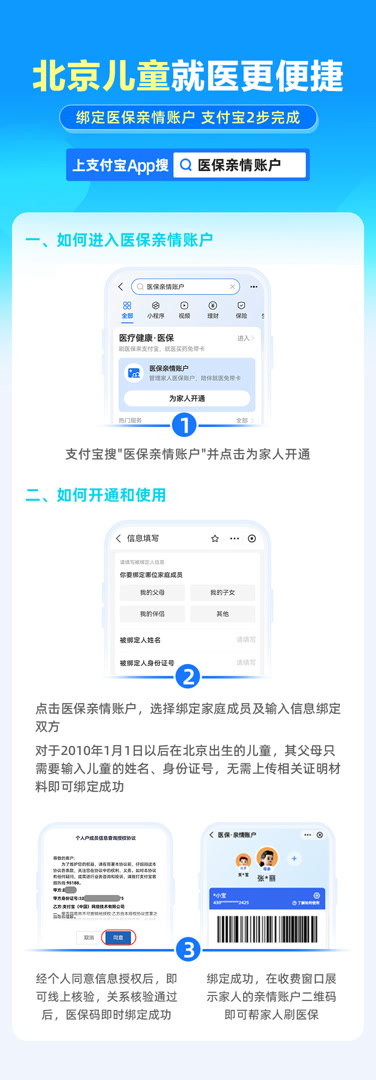 如何体验这项全新升级后的医保服务?具体而言,北京市医保参保人只需打开支付宝APP,于首页搜索“医保亲情账户”,点击“为家人开通”,仅需输入儿童姓名和身份证号,即可轻松完成绑定。需要注意的是,被绑定人仅针对北京地区2010年1月1日后出生的儿童(即在北京市领取出生医学证明的儿童),家长全流程不再需要提交身份证、户口本、出生证等材料。