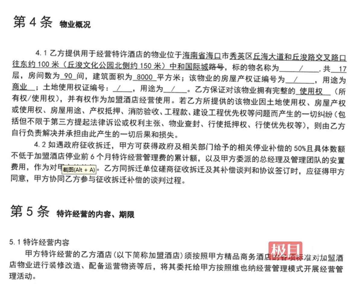 “当时合同是韩某邮寄过来的,上面写的用于特许经营的物业地址我看了一眼,跟我们酒店所在地址不符。”张先生给记者提供的协议显示,经营特许酒店的物业是位于海口市秀英区的“中和国际城”,而酒店实际地址是在秀英区丘海大道80号文汇雅居A栋。