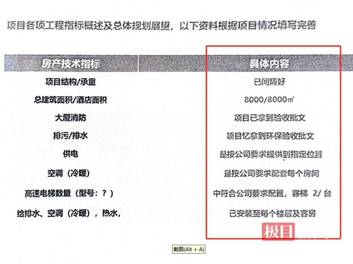 1月9日,张先生给极目新闻记者发来一份《海南省海口市秀英区海南中和国际城加盟项目投资分析报告》(下称《报告》),该报告为韩某在双方合约签署前完成,并盖有深圳市维也纳国际酒店管理有限公司的公章。报告中,该项目的总建筑面积、大厦消防、供电、空调、电梯等指标显示都很“完善”,如电梯数量“客梯2台”,空调“按要求配套每个房间”,项目结构“已间隔好”。