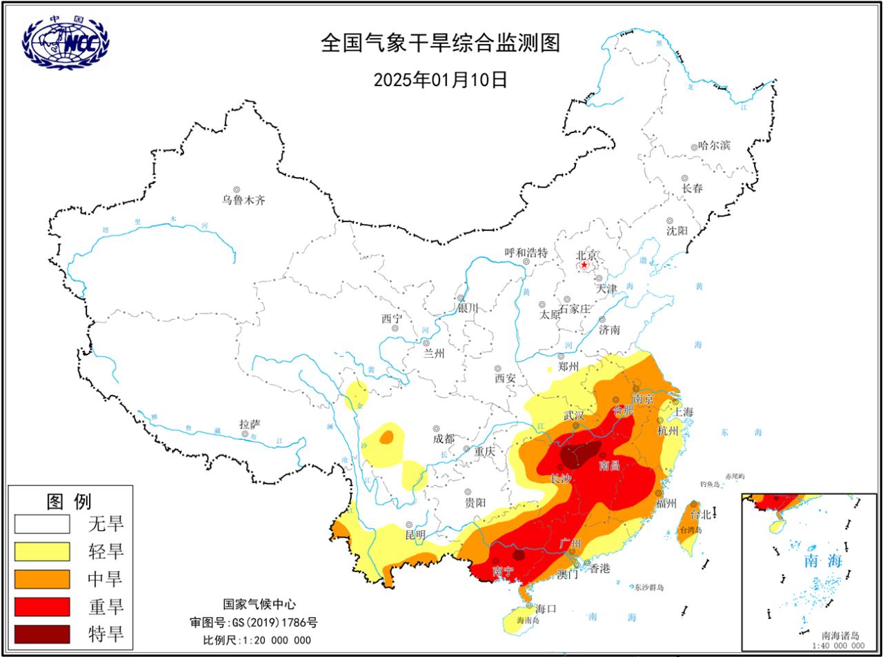 受持续降水偏少影响,目前江南华南一带气象干旱发展,广西、广东、湖南、江西、福建、安徽、湖北出现成片气象重旱,局地气象干旱等级为特旱。