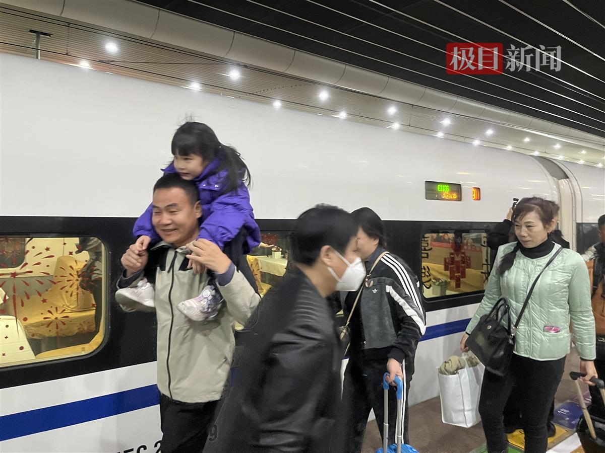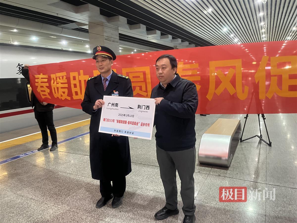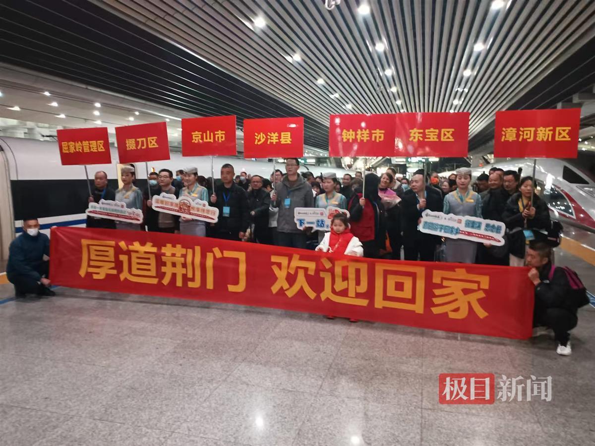 极目新闻记者了解到,两节前后,是湖北籍在外务工人员返乡的高峰期。为积极引导他们返乡就业创业,让返乡人员充分感受家乡的暖心关怀,1月12日至1月17日,荆门市人社局连续6天开通北京、上海、广州(每地2趟)直达荆门的“圆梦高铁·接您回家”免费返乡专列,迎接约2000名荆门籍在外经商务工人员回家过年。