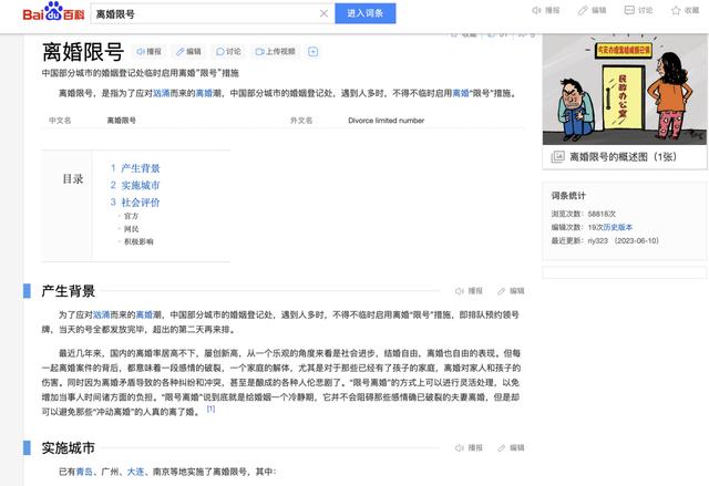 另外在“产生背景”一栏中写道:离婚限号即排队预约领号牌,当天的号全都发放完毕,超出的第二天再来排。在某平台,该词条最近一次的更新信息日期为2020年9月。