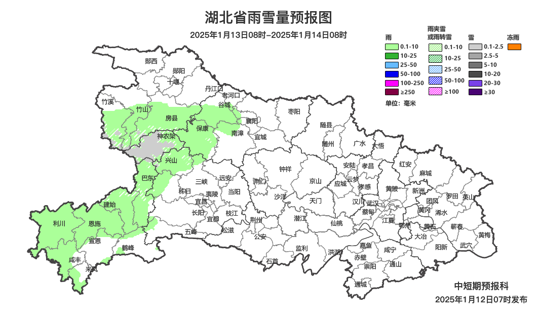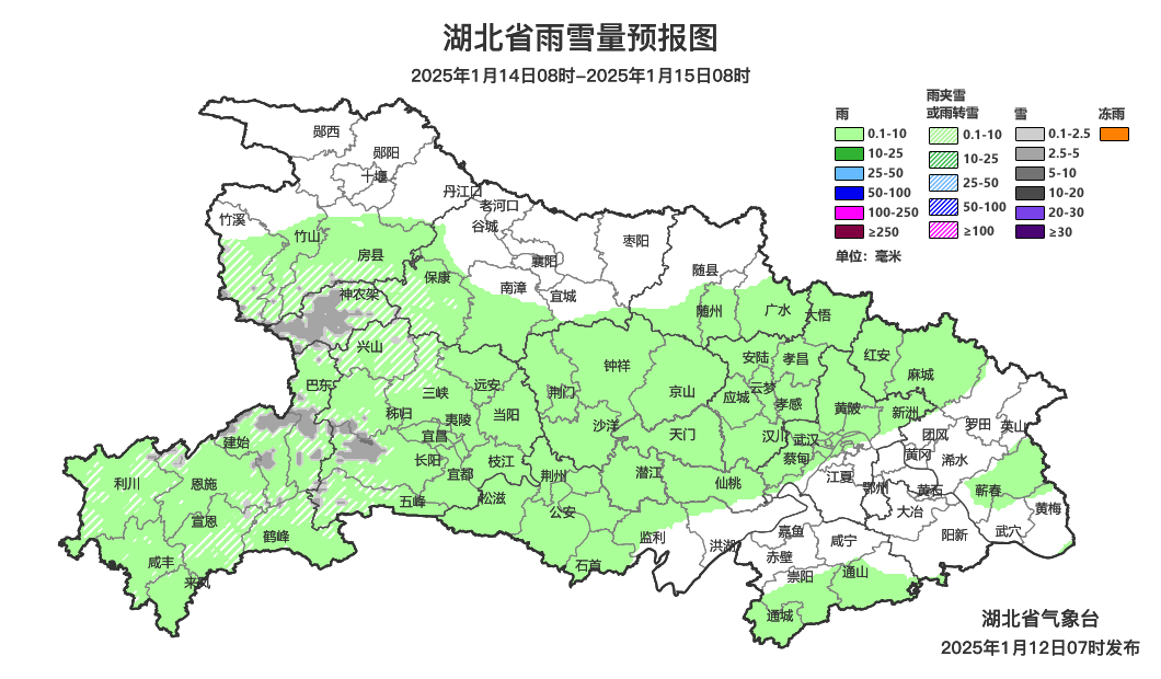 1月13日08时-14日08时,全省多云转阴天,晚上鄂西北、鄂西南部分地区有小雨,高海拔地区有雨夹雪或雪。最高气温西部11~15℃、中东部15~19℃,最低气温北部-3~1℃、南部1~5℃,偏南风转偏北风2到3级。