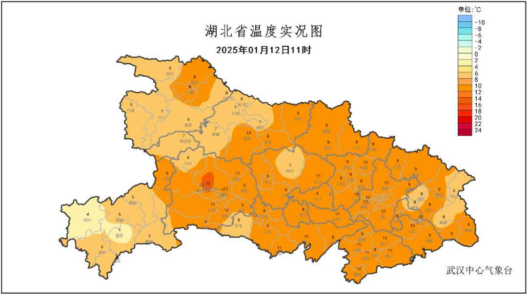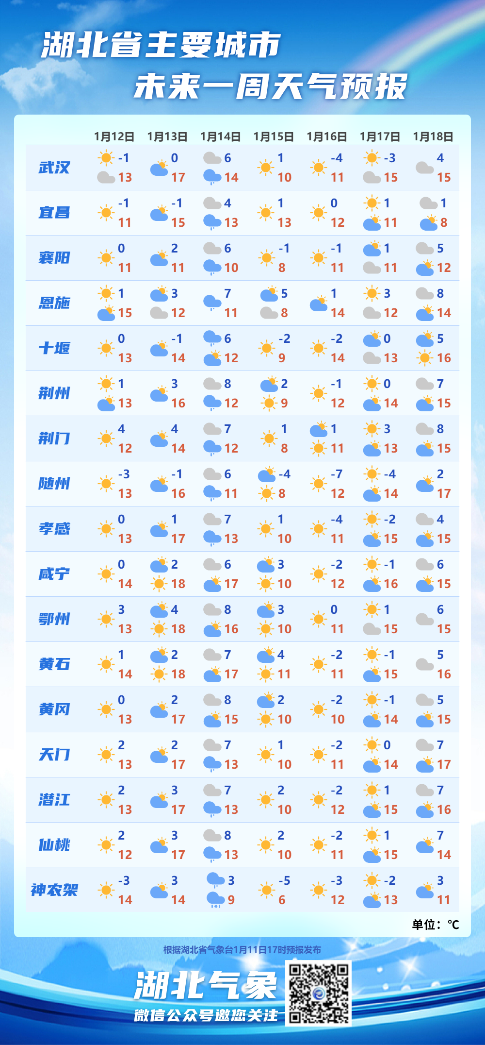 1月12日08时-13日08时,湖北全省晴天到多云。最高气温11~17℃,最低气温北部-4~-1℃、南部-1~3℃,偏北风转偏南风2到3级。