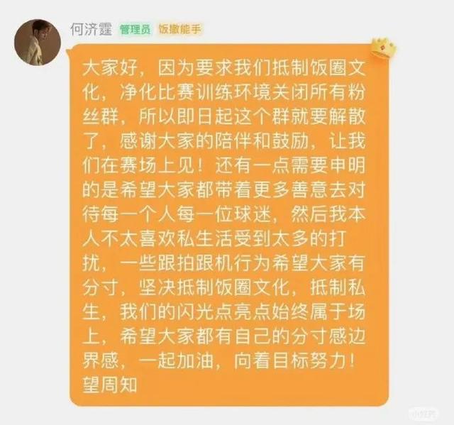 综合潮新闻报道,网传截图显示,在粉丝群解散前,国手何济霆给粉丝留言:
