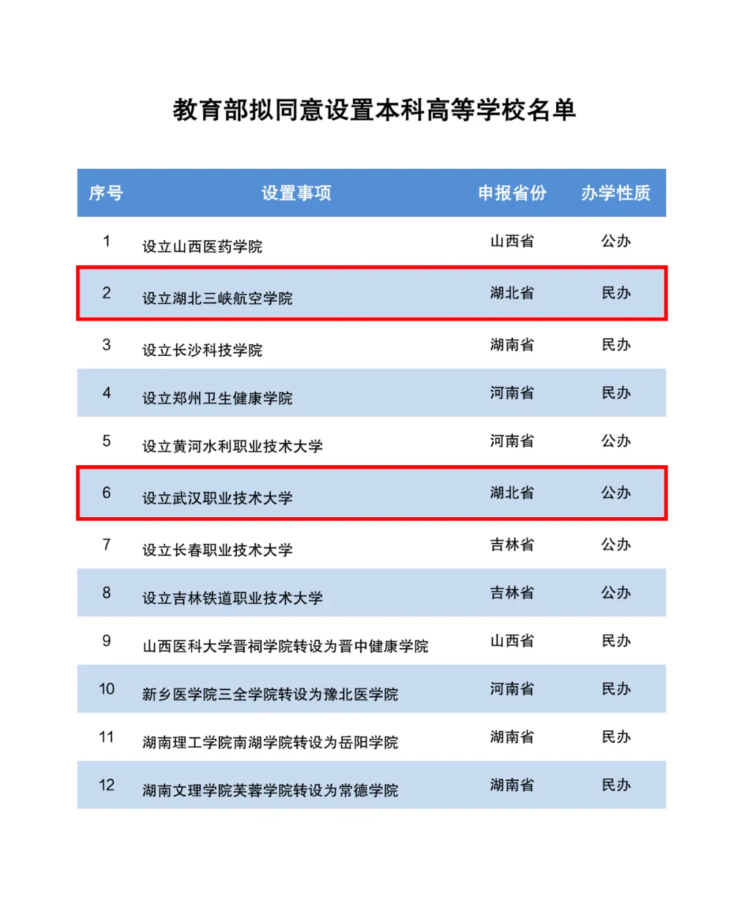 1月15日,教育部网站发布《关于拟同意设置本科高等学校的公示》,拟同意设置12所本科高等学校。其中,我省新增湖北三峡航空学院、武汉职业技术大学两所本科高校。