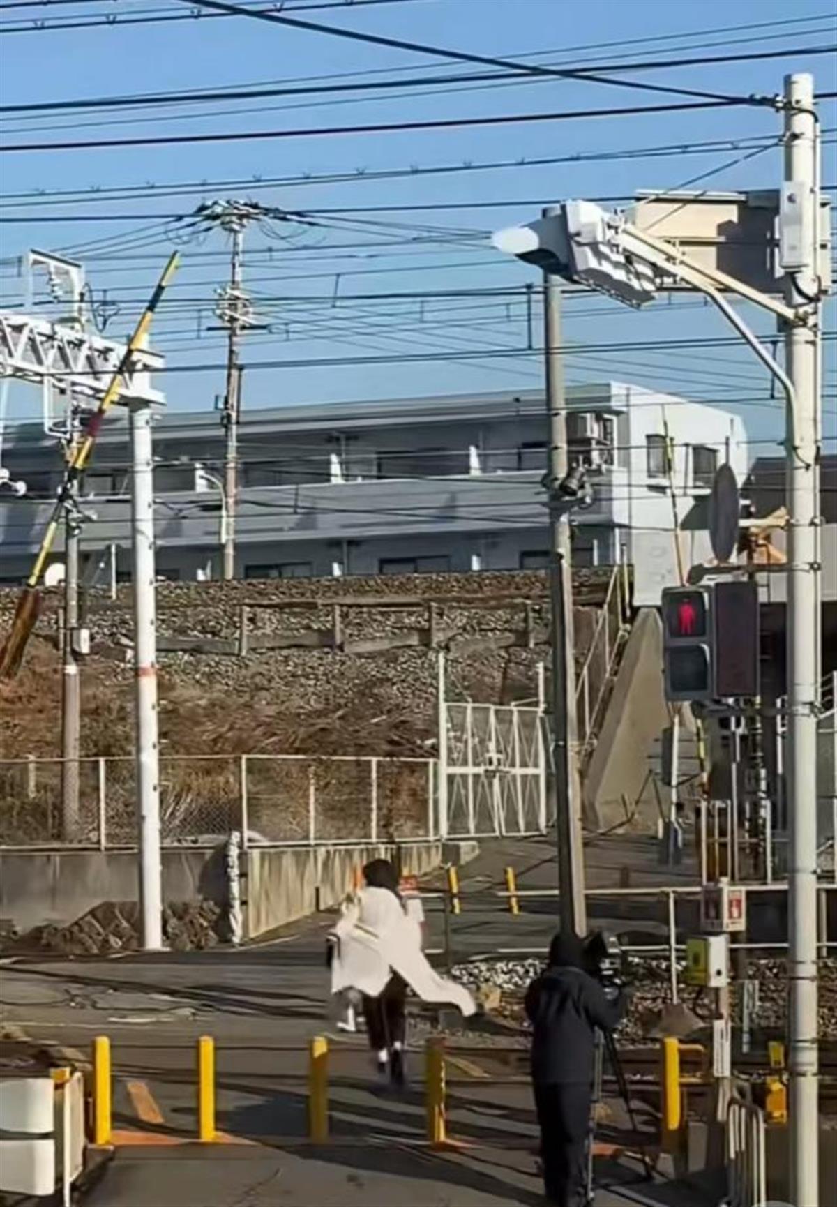 日本记者在现场测试小跑穿越道口所需时间(图源:社交媒体)