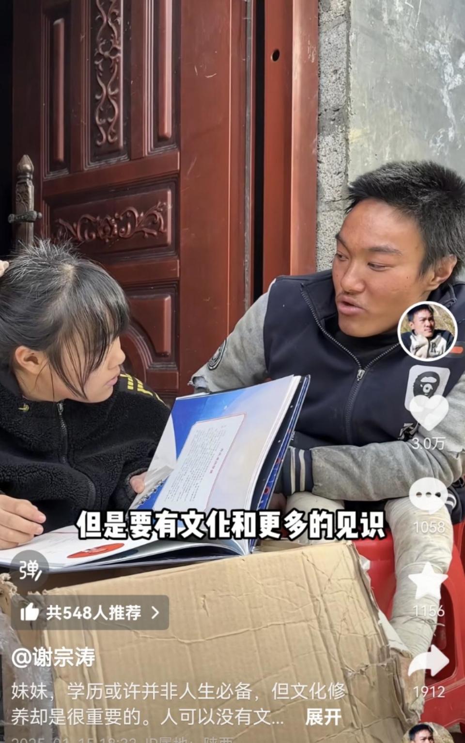 1月18日,红星新闻记者从当地政府工作人员处了解到,谢宗涛在视频上呈现的内容属实,父母已离世,还有一个妹妹,2023年还被评为汉中市第二季度“最美系列人物”。中共汉中市委文明办关于谢宗涛的简介介绍,父母相继因病和意外离世,留下谢宗涛和尚在幼年且患有白内障的妹妹,与60多岁哑巴大叔谢叙祥和50多岁的幺叔谢叙发组成了一个“残疾”的家。“他的一双手不仅要用来走路,还要撑起整个家,他勤劳懂事,孝敬着两个叔叔,呵护着残疾妹妹成长。”