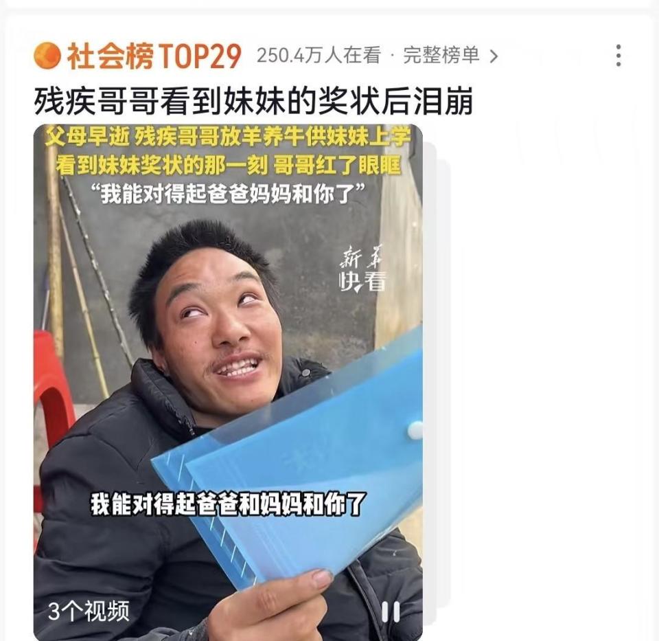 近日,“残疾哥哥看到妹妹的奖状后泪崩”登上视频热搜。视频中,一名叫谢宗涛的陕西残疾小伙看到妹妹拿的奖状红了眼眶,说“我能对得起爸爸、妈妈和你了”。
