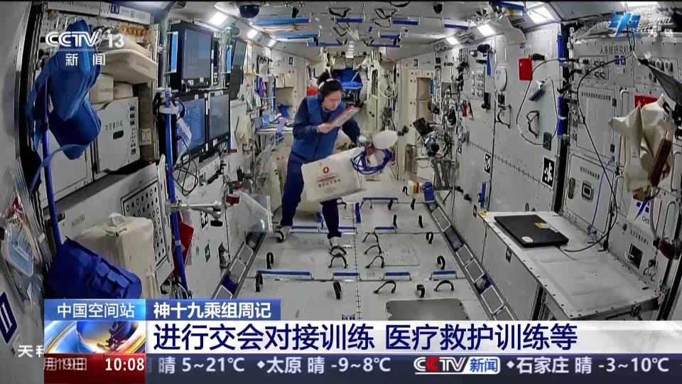 上周,多项在轨训练相继开展。交会对接训练是航天员在轨期间的专业技术训练之一,乘组利用元认知训练系统,完成了不同初始条件下的图像辨识等训练内容。此外,乘组开展了医疗救护在轨训练及模拟空间站失火工况下紧急撤离的应急救生在轨训练。