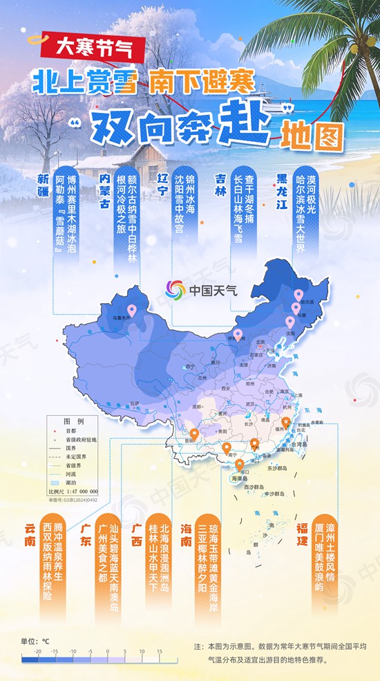 转眼,我们已经迎来了二十四节气的最后一个节气——大寒。“时至岁末有大寒,天寒地冻雪满山”,寒冷的季节里,我们总是不自觉地想把自己“藏”起来,其实冬天仍有不可辜负的好风光。寒假已至,“小土豆”、“小砂糖橘”、“小冻梨”们又纷纷出动,北上赏雪,南下避寒,南北互跨游已经成为冬季旅游的新风尚。大寒时节,我国南北方又有什么值得一游的好地方呢?中国天气推出大寒节气“双向奔赴”地图,与您共赴一场冬日浪漫之约。