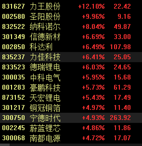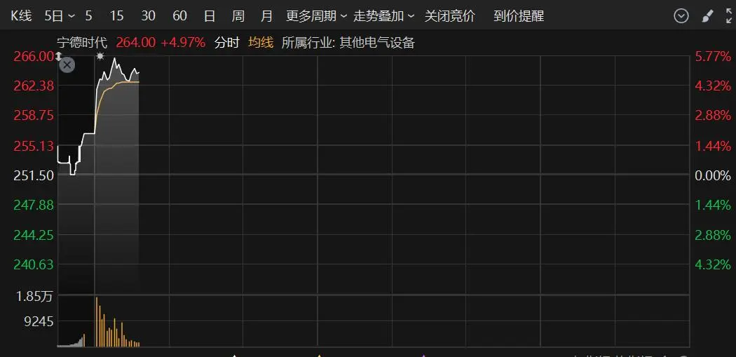 电池概念股拉升,宁德时代开盘后直线上扬,大涨近5%。