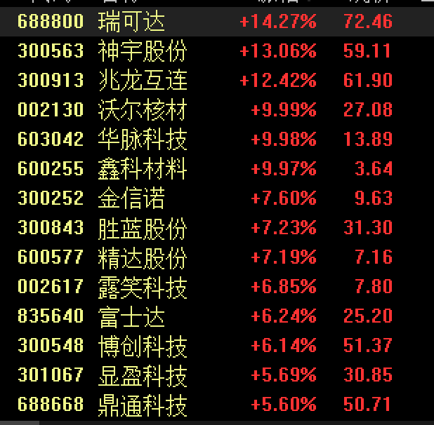 铜缆高速连接概念走强,瑞可达、神宇股份、兆龙互连、沃尔核材、华脉科技、鑫科材料等多股涨停或涨超10%。