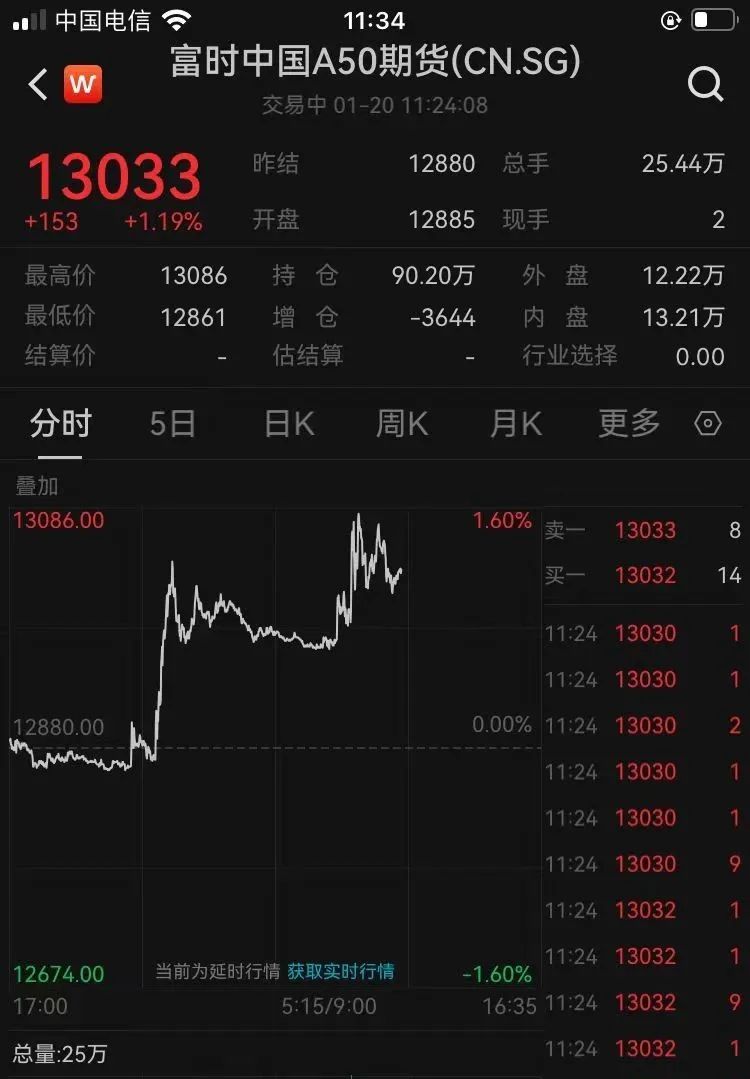 富时中国A50指数期货盘中拉升,一度大涨超1.5%,截至发稿,涨超1%。