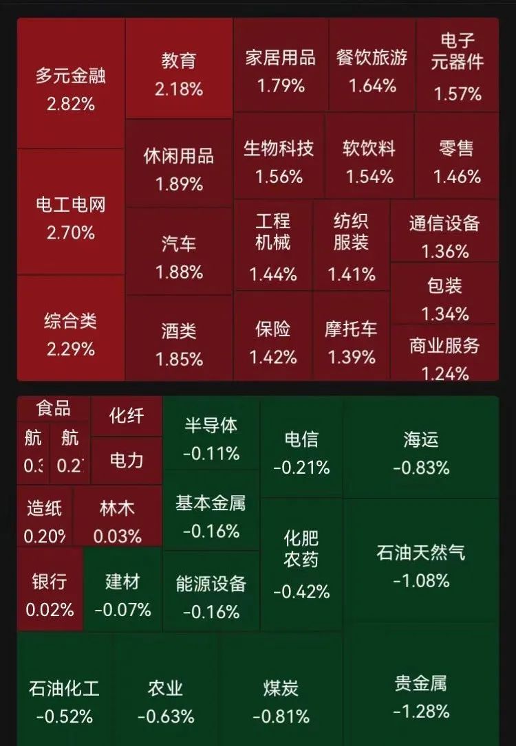 盘面上,多元金融、教育、电工电网涨幅居前,教育、休闲用品、汽车拉升,贵金属、石油天然气跌幅居前。