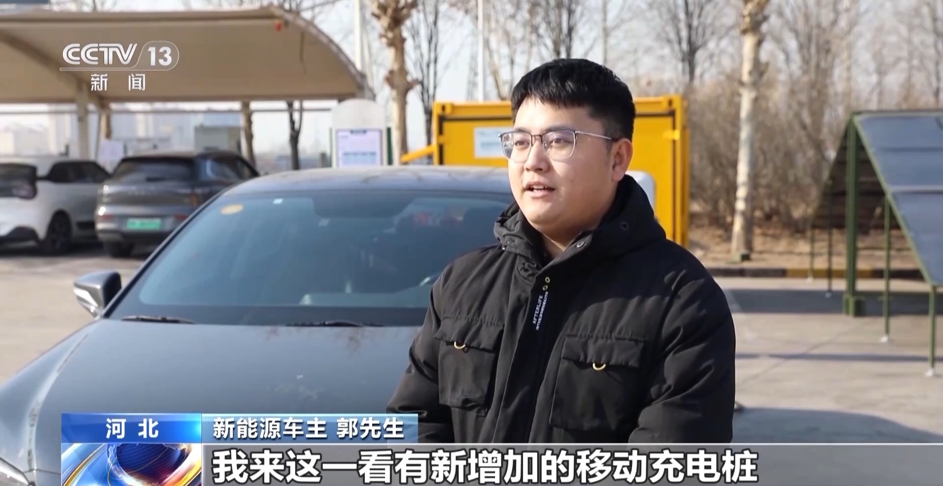 新能源车主郭先生:上路之前,我还担心这个服务区充电桩排队的问题。我来这一看,有新增加的移动充电桩。来了就能充,充完了就能走,我觉得这挺方便的。