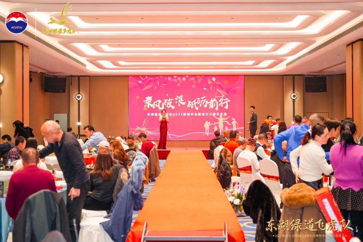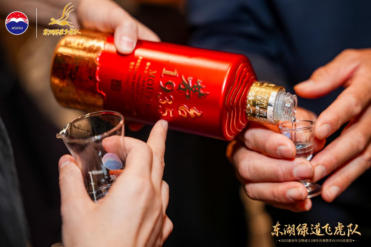 1月12日,记者来到武昌金贵源食神酒店,遇到东湖绿道飞虎队正在举办2025新春年会,同时庆祝队伍成立3周年,桌上用酒正是茅台1935,来自各方的140位嘉宾齐聚一堂,共同见证这一意义非凡的时刻,在欢声笑语中分享喜悦,携手共进。
