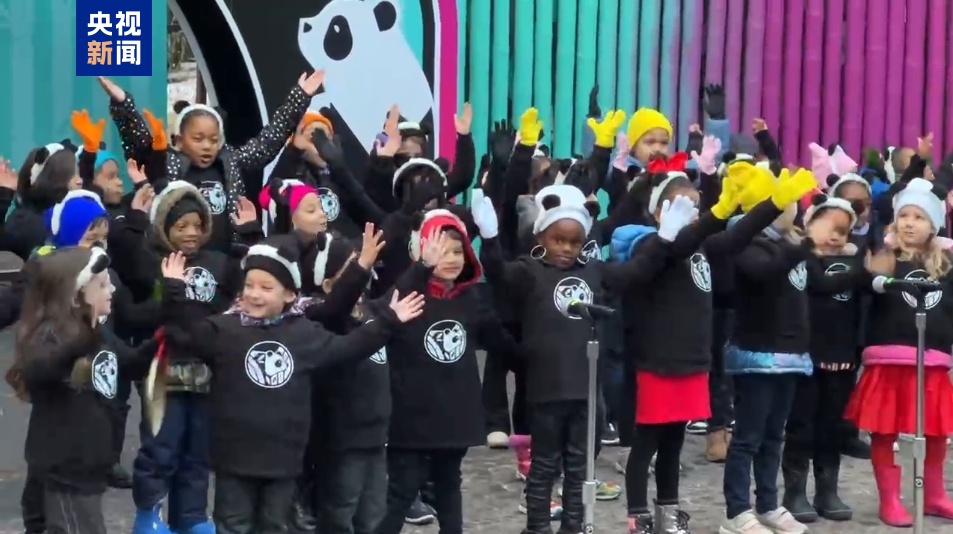 当天,中美小朋友联合表演节目,欢迎大熊猫与民众见面。